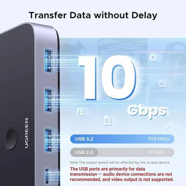 Devices: The USB 3.2 switch provides 1 USB C port and 3 USB A ports for connecting various devices. 4 USB ports can extend the number of ports for two computers and improve work efficiency. (When using the switch with a USB hub, be careful not to connect too many high-power devices to avoid insufficient power supply. )