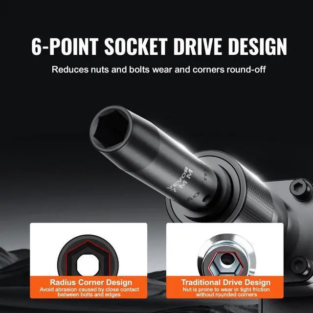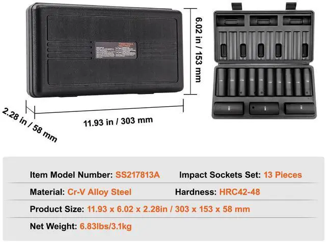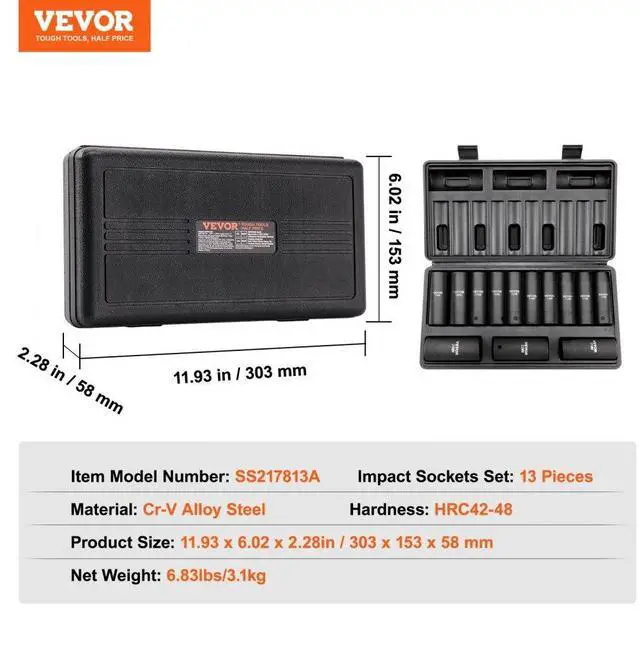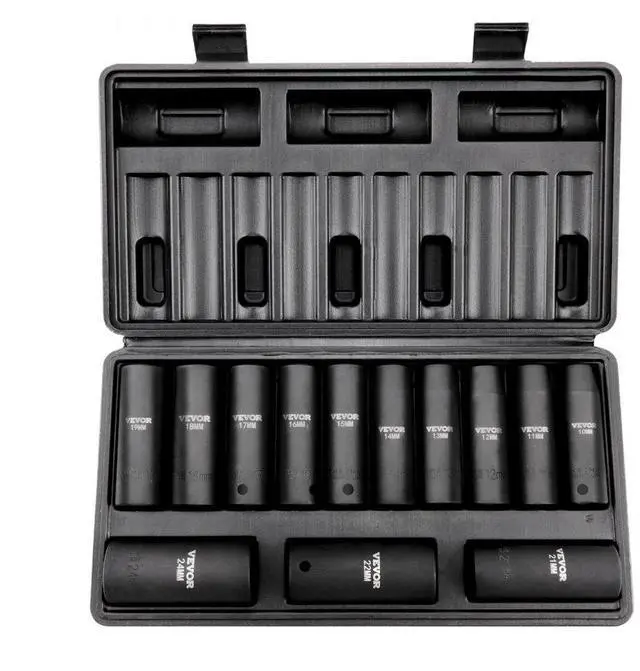 VEVOR 1/2" Drive Impact Socket Set, 13 Piece Deep Socket Set Metric 10-24mm, 6 Point CR-V Alloy Steel for Auto Repair, Easy-to-Read Size Markings, Rugged Construction, Includes Storage Case, Rugged and Durable, Complete