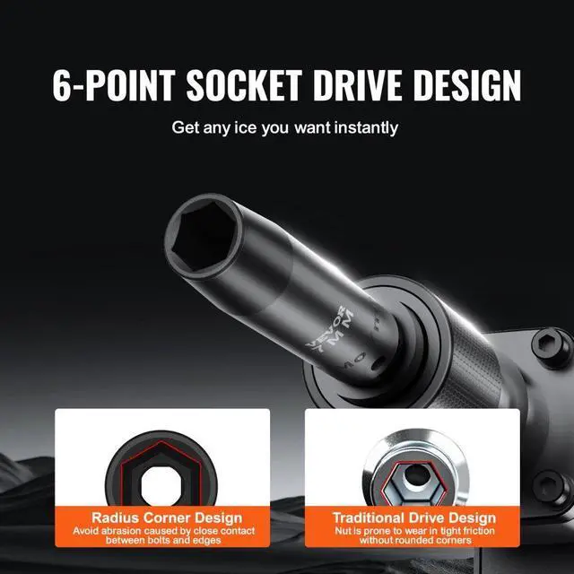 , The hexagonal socket design creates a gap between the nut and the edges during operation, preventing excessive friction and wear. It can withstand greater impact force and effectively remove bolts., Using laser etching and rolling processes, the extra-large size markings on the sockets are clear and easy to identify even under various lighting conditions. The markings are also resistant to wear., The split-strengthened case ensures durability and is less prone to breakage compared to traditional one-piece storage. The portable design allows you to easily carry it for work on the go.