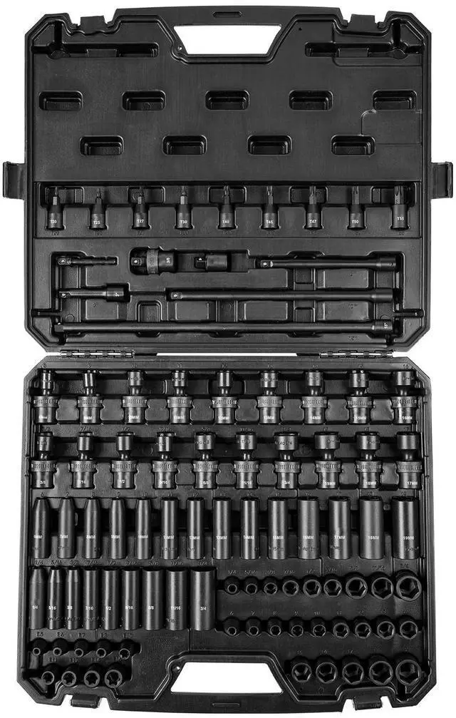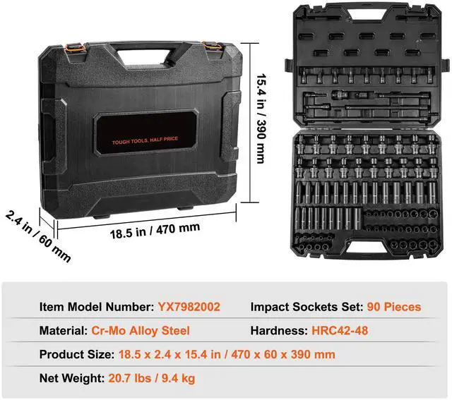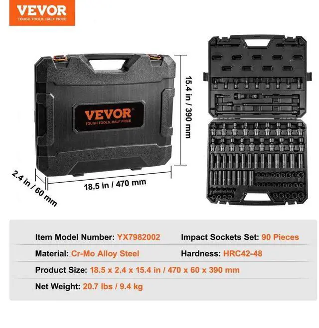 VEVOR 3/8" Drive Impact Socket Set, SAE 1/4"-3/4" and Metric 6-19mm 90 Piece Socket Set, 6 Point Cr-Mo Alloy Steel for Auto Repair, Includes Extension Bars Universal Joint Adapter Lock Storage Case, The impact socket set, made from Cr-Mo industrial-grade alloy steel, undergoes heat treatment processes such as high-temperature quenching and low-temperature forging, resulting in a hardness level of HRC42-48., With a pro configuration of 90 pieces, this set can be used with electric wrench, impact wrench, ratchet wrench, rod bender, and other tools for automotive maintenance, equipment assembly, industrial manufacturing, power inspections, and more.