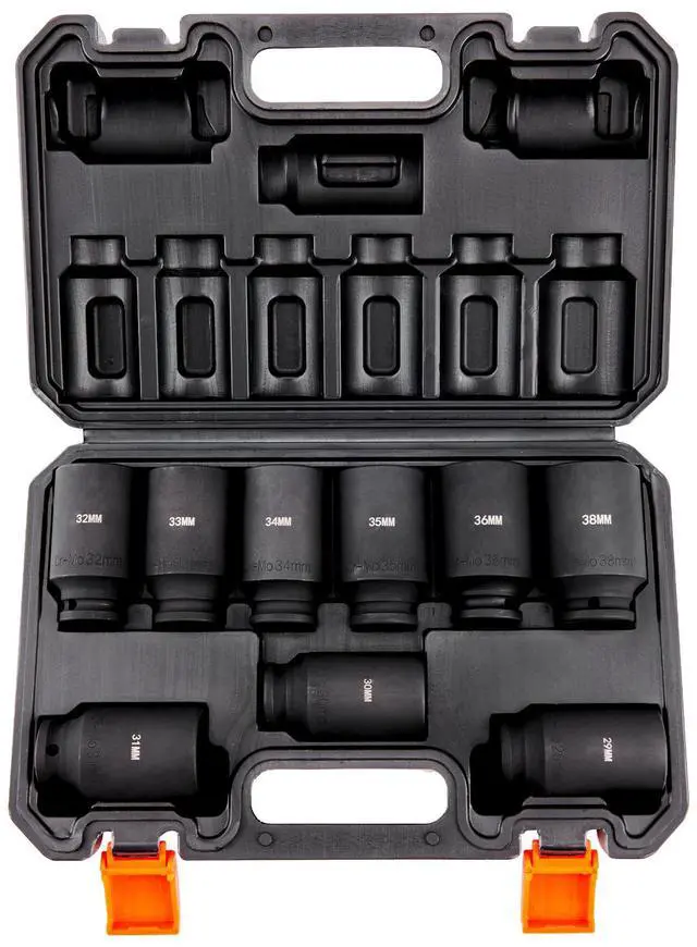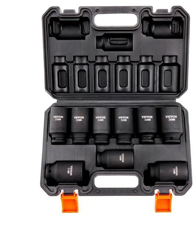 VEVOR 1/2" Drive Impact Socket Set, 9 Piece Deep Socket Set Metric 29-38mm, 6 Point Cr-Mo Alloy Steel for Auto Repair, Easy-to-Read Size Markings, Rugged Construction, Includes Storage Case, Rugged and Durable, Complete