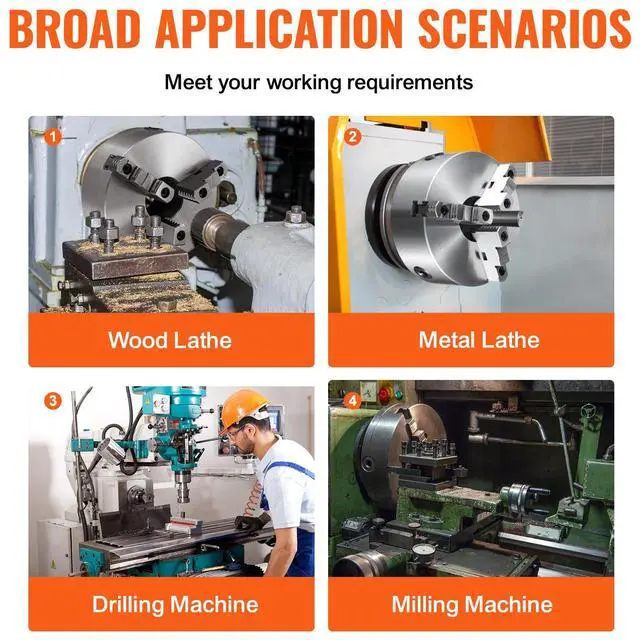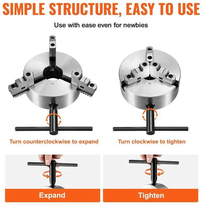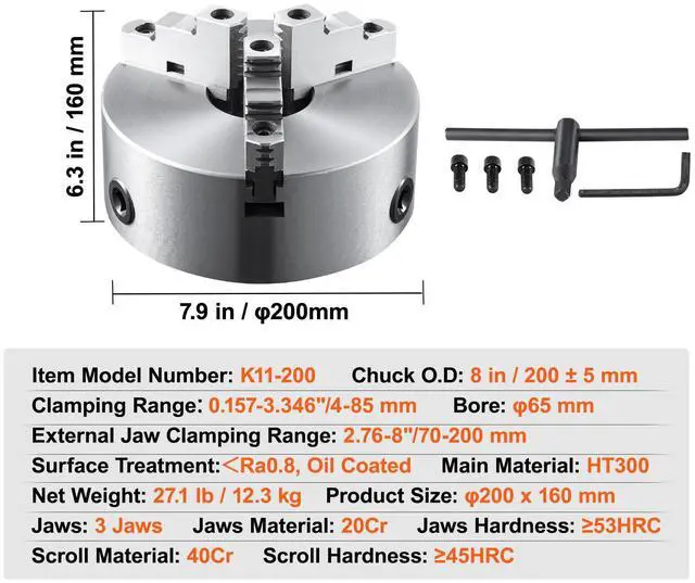VEVOR 3-Jaw Lathe Chuck, 8'', Self-Centering Lathe Chuck, 0.16 -8 in/4-200 mm Clamping Range with T-key Fixing Screws Hexagon Wrench, for Lathe 3D Printer Machining Center Milling Drilling Machine, Exceptional Durability, Outstanding Operating Precision, Adjustable Chuck Jaw, Easy to Use, Wide Application, Self-Centering Function, Clamping