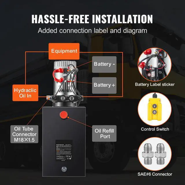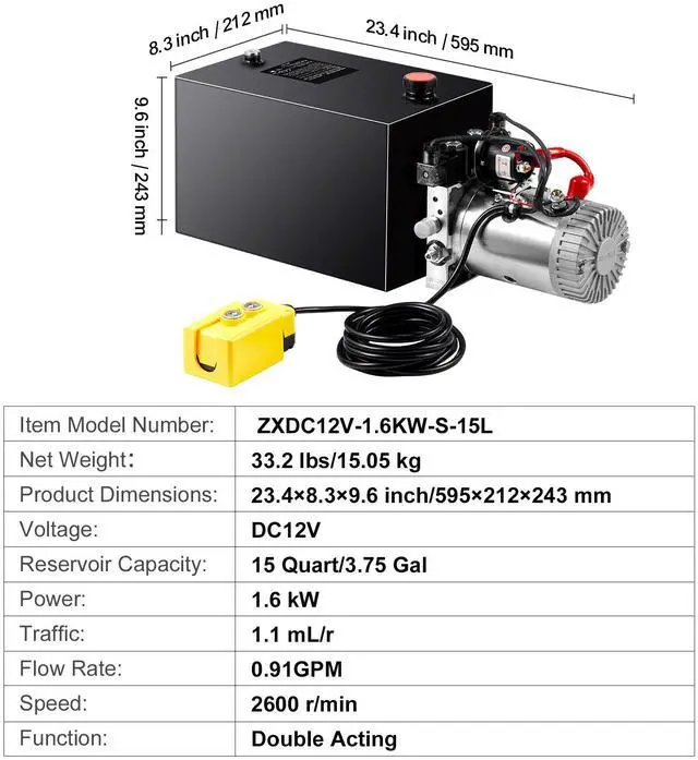 VEVOR Hydraulic Pump, 15 Quart Hydraulic Power Unit, Double Acting Dump Trailer Pump, 0.91 GPM Flow Rate, 3200 PSI Max Relief Pressure, DC 12V Hydraulic Pump for Dump Trailer Car Lifting, Heavy Machinery Made Easy, Double the Efficiency, Safety First, Professional-Grade Performance, Simplified Setup, Effortless Flow Control,