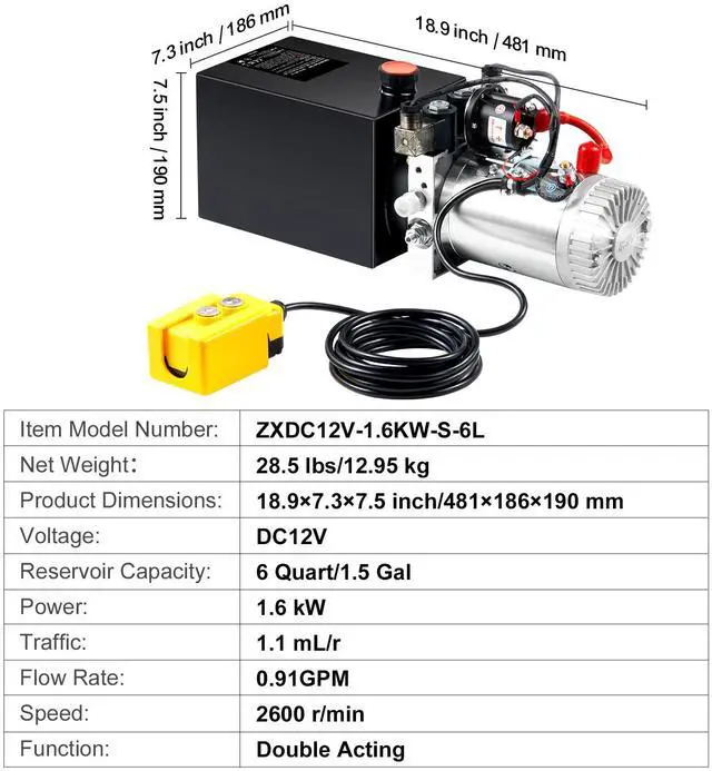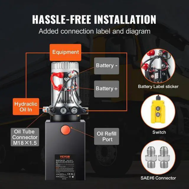 VEVOR Hydraulic Pump, 6 Quart Hydraulic Power Unit, Double Acting Dump Trailer Pump, 0.91 GPM Flow Rate, 3200 PSI Max Relief Pressure, DC 12V Hydraulic Pump for Dump Trailer Car Lifting, Heavy Machinery Made Easy, Double the Efficiency, Safety First, Professional-Grade Performance, Simplified Setup, Effortless Flow Control,