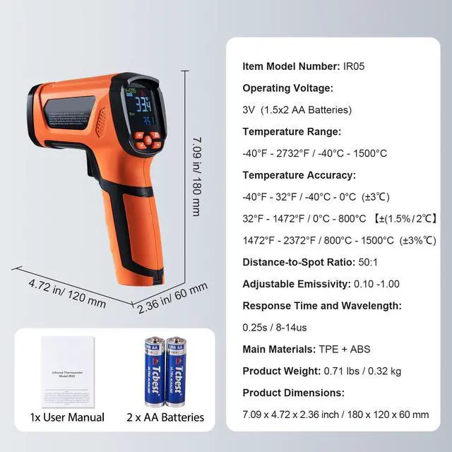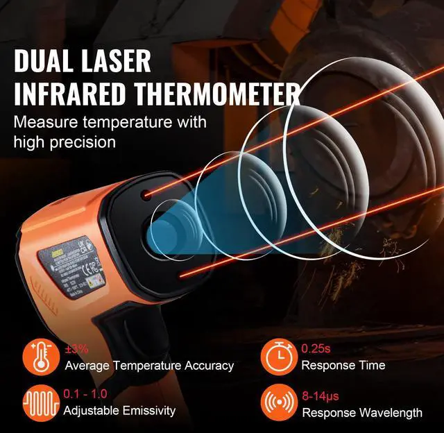 VEVOR Infrared Thermometer, -40~2732°F Dual Laser Temperature Gun Non-Contact, Handheld IR Heat Temperature Gun with Adjustable Emissivity for Metal Smelting/Cooking/Pizza Oven/Engine (Not for Human), Safety First, Wide Temperature Range, Extended Distance Measurement, Detail-Oriented Design, Quick Alerts, Versatile