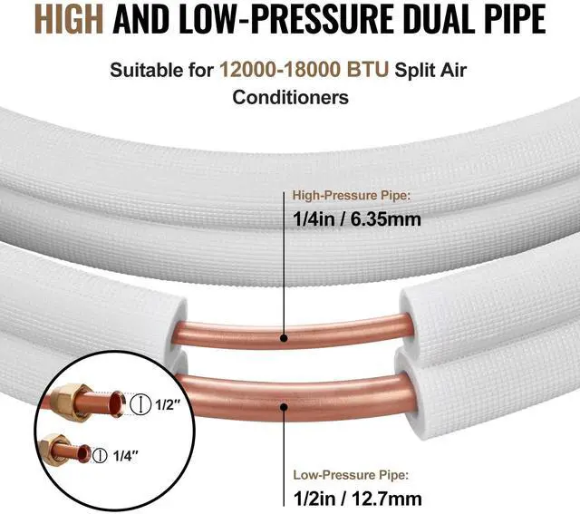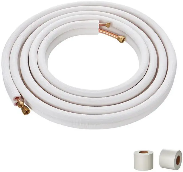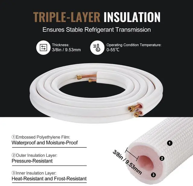 VEVOR 25FT Mini Split Line Set, 1/4" & 1/2" O. D Copper Pipes Tubing and Triple-Layer Insulation, for Mini Split Air Conditioning Refrigerant or Heating Pump Equipment & HVAC with Wrapping Strips., High Flexibility, One Pipe For Multiple Uses, Stringent Material Quality Control, Unquestionable Thermal Insulation, Simple Installation, Long Lifespan, Overall Dimensions (L x W x
