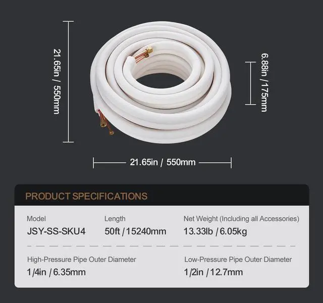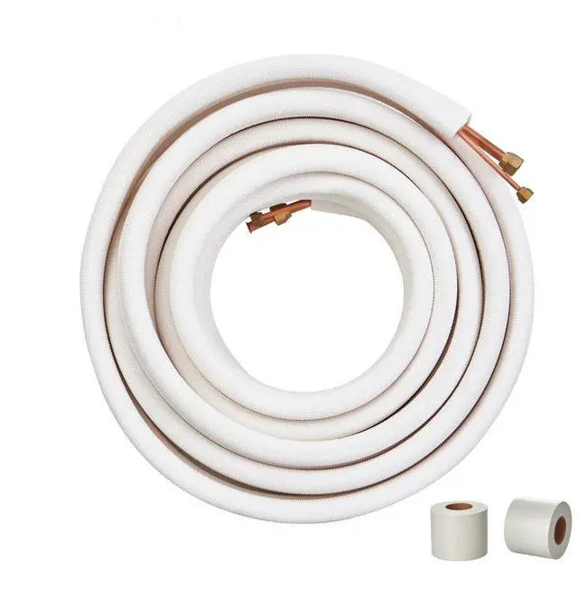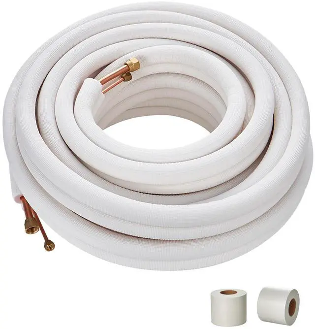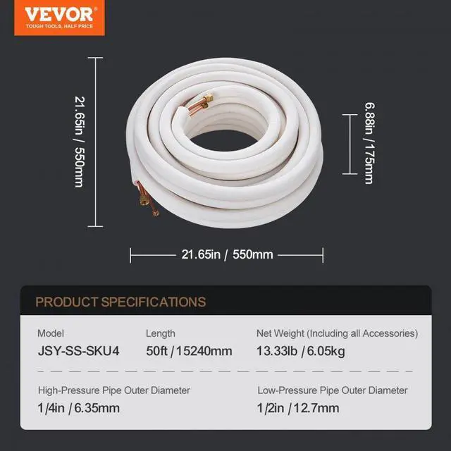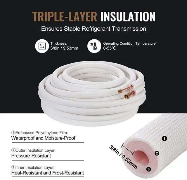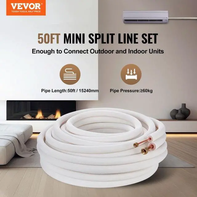 VEVOR 50FT Mini Split Line Set, 1/4" & 1/2" O. D Copper Pipes Tubing and Triple-Layer Insulation, for Mini Split Air Conditioning Refrigerant or Heating Pump Equipment & HVAC with Wrapping Strips., High Flexibility, One Pipe For Multiple Uses, Stringent Material Quality Control, Unquestionable Thermal Insulation, Simple Installation, Long Lifespan, Overall Dimensions (L x W x