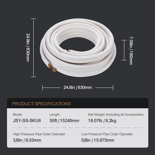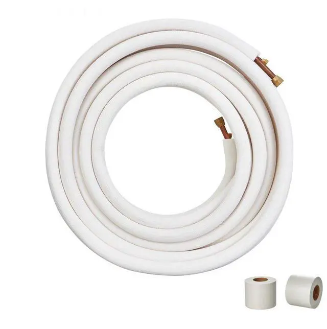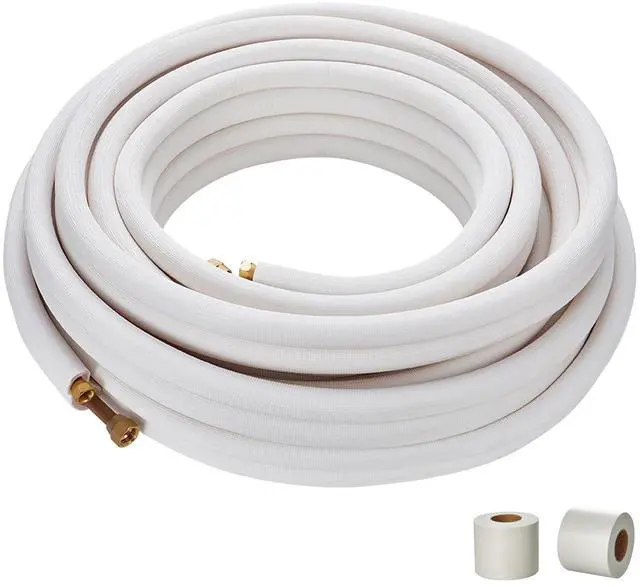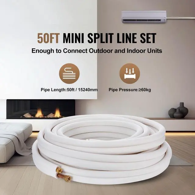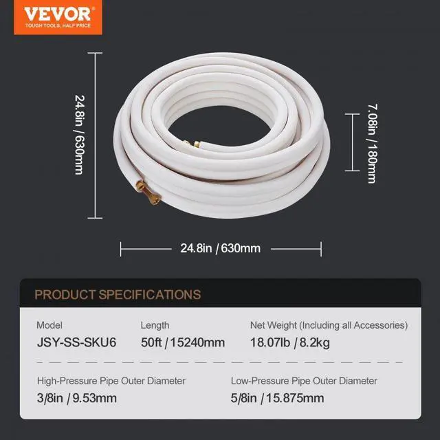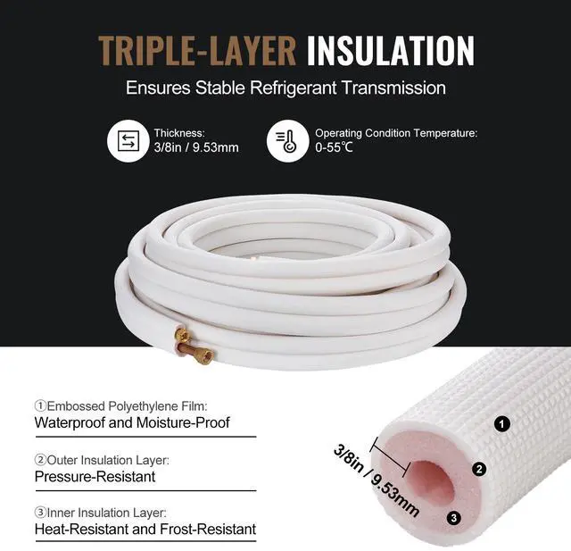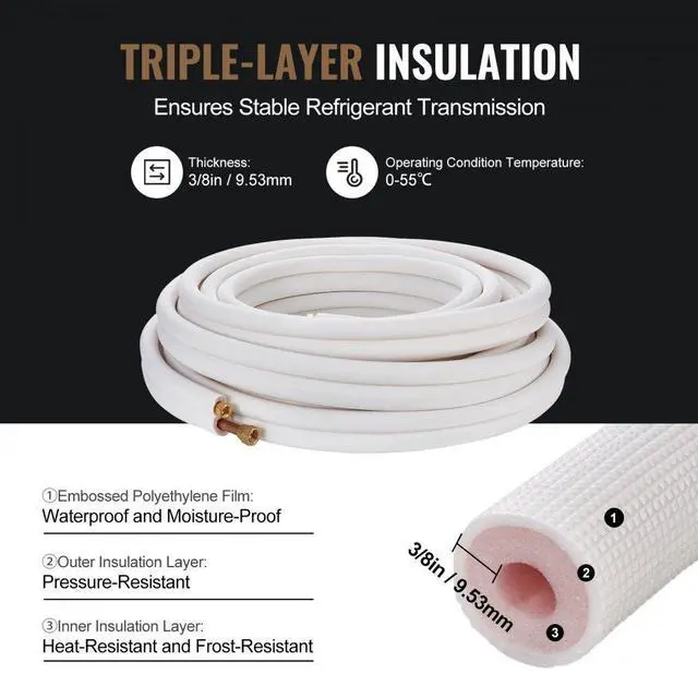 VEVOR 50FT Mini Split Line Set, 3/8" & 5/8" O. D Copper Pipes Tubing and Triple-Layer Insulation, for Mini Split Air Conditioning Refrigerant or Heating Pump Equipment & HVAC with Wrapping Strips., High Flexibility, One Pipe For Multiple Uses, Stringent Material Quality Control, Unquestionable Thermal Insulation, Simple Installation, Long Lifespan, Overall Dimensions (L x W x