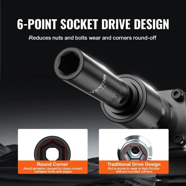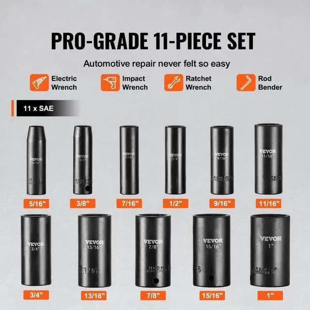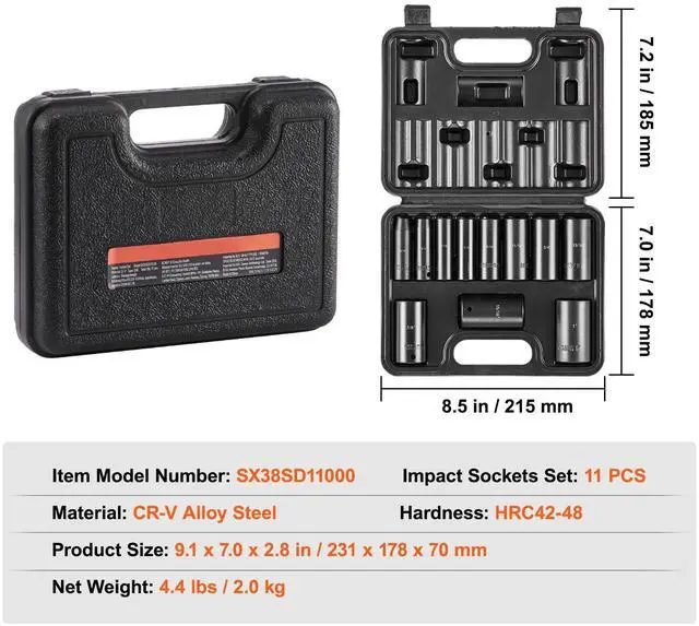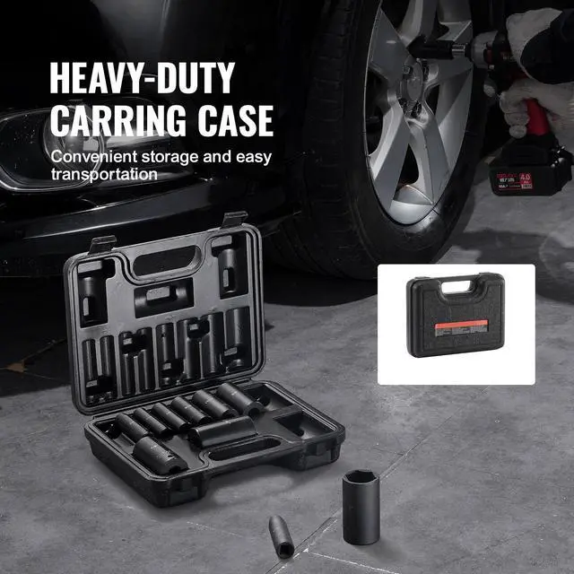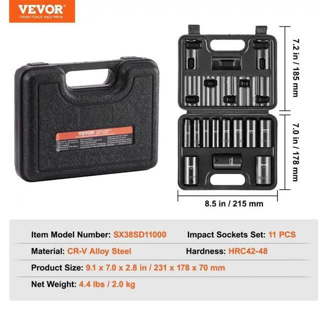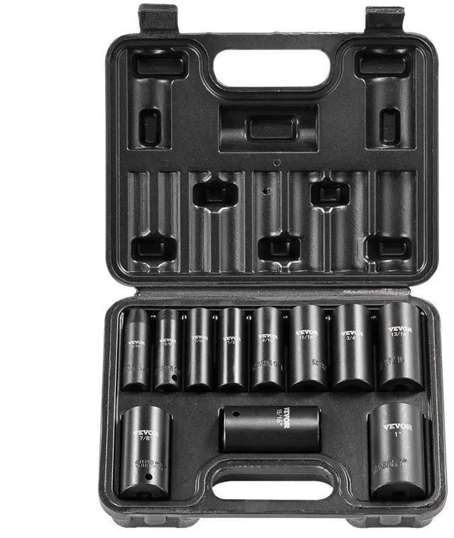VEVOR Impact Sockets Set 11pcs 6-Point 3/8in Drive Bit Ratchet Tool Kit Case, Rugged and Durable, Complete