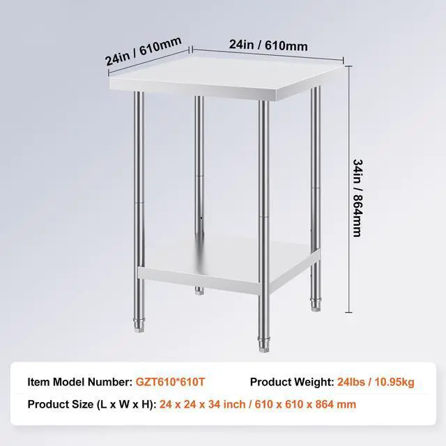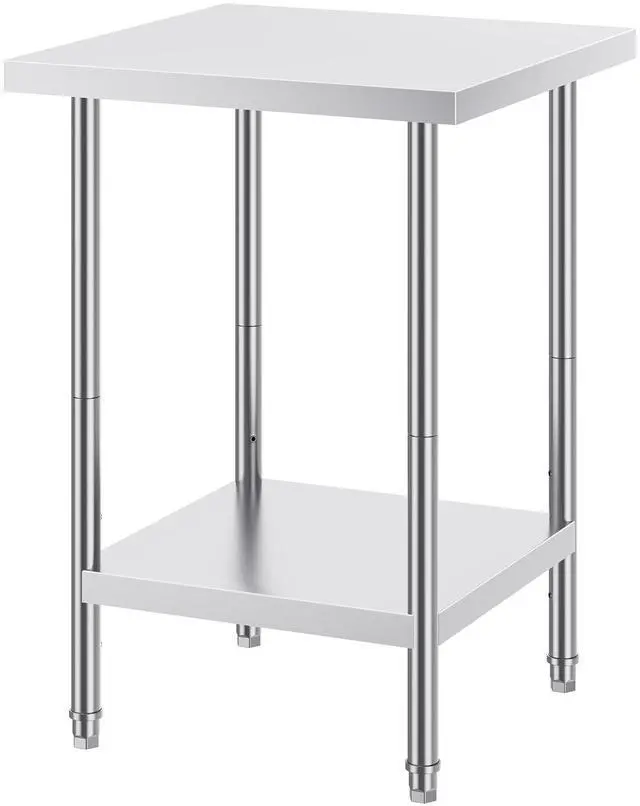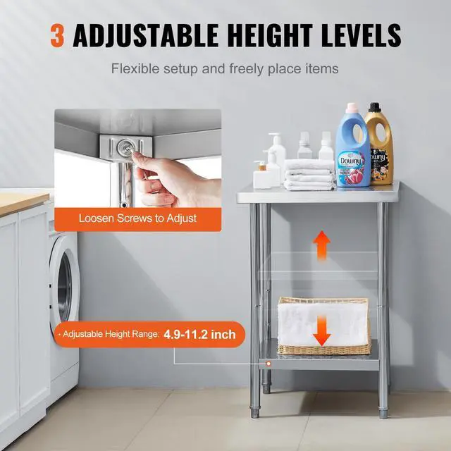VEVOR Stainless Steel Prep Table, 24 x 24 x 34 Inch, Heavy Duty Metal Worktable with 3 Adjustable Height Levels, Commercial Workstation for Kitchen Garage Restaurant Backyard, Stylish Work Table, Multiple Styles Available, Durable, Safe, and Stable, Flexible Setup, Easy to Install, Versatile Applications,