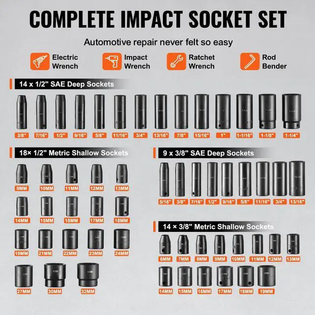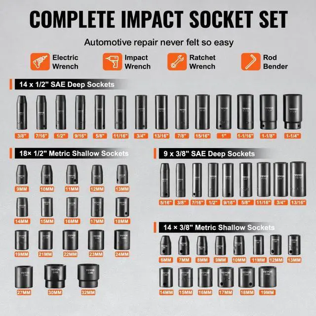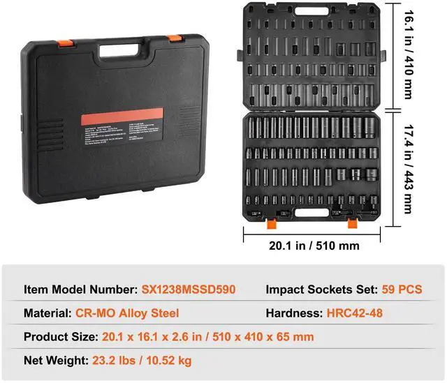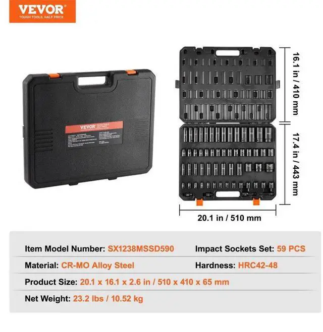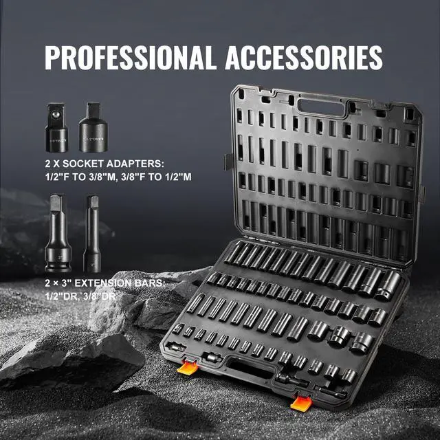 VEVOR Impact Sockets Set 59pcs 6-Point 3/8" & 1/2" Drive Bit Ratchet Tool Kit, Rugged and Durable, Complete