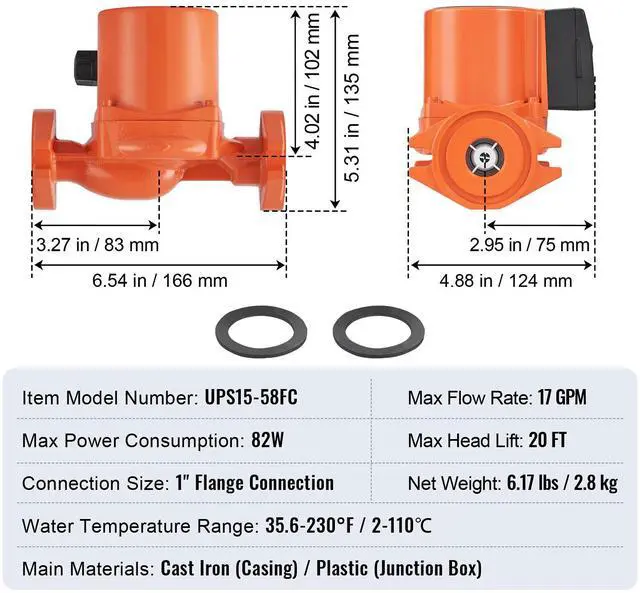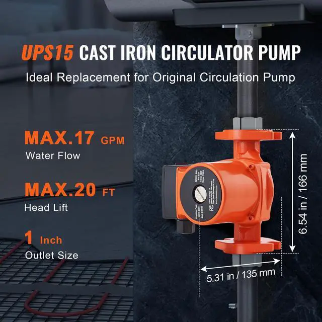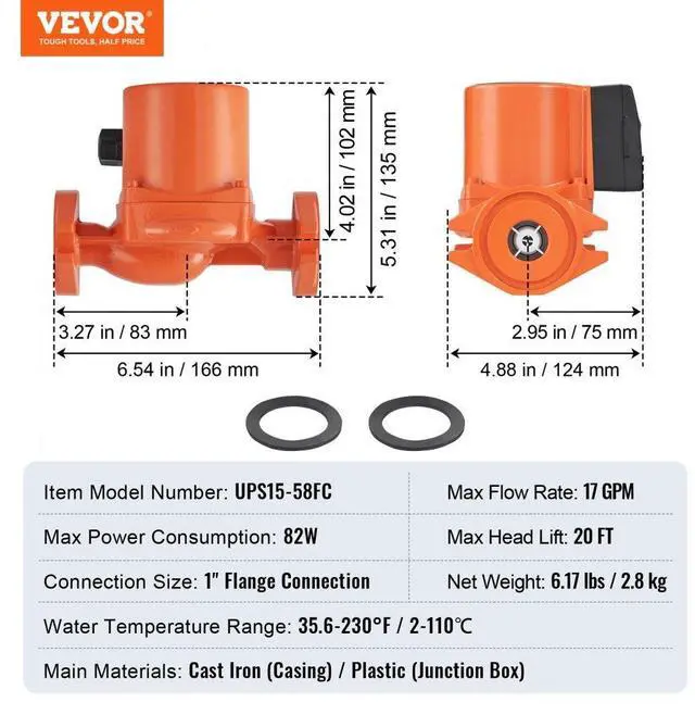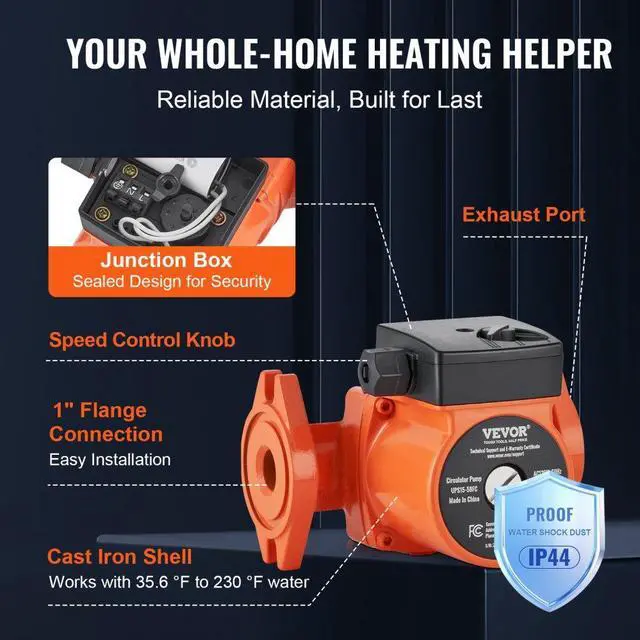 VEVOR UPS15-58FC Hot Water Circulation Pump 110V 82W 17 GPM Recirculating Pump, Consistent Indoor Comfort, Energy-Efficient Performance, Leak-Proof Protection, Essential Air Venting, Installation Environment Requirements, IP44 Dust & Water Protection, Main