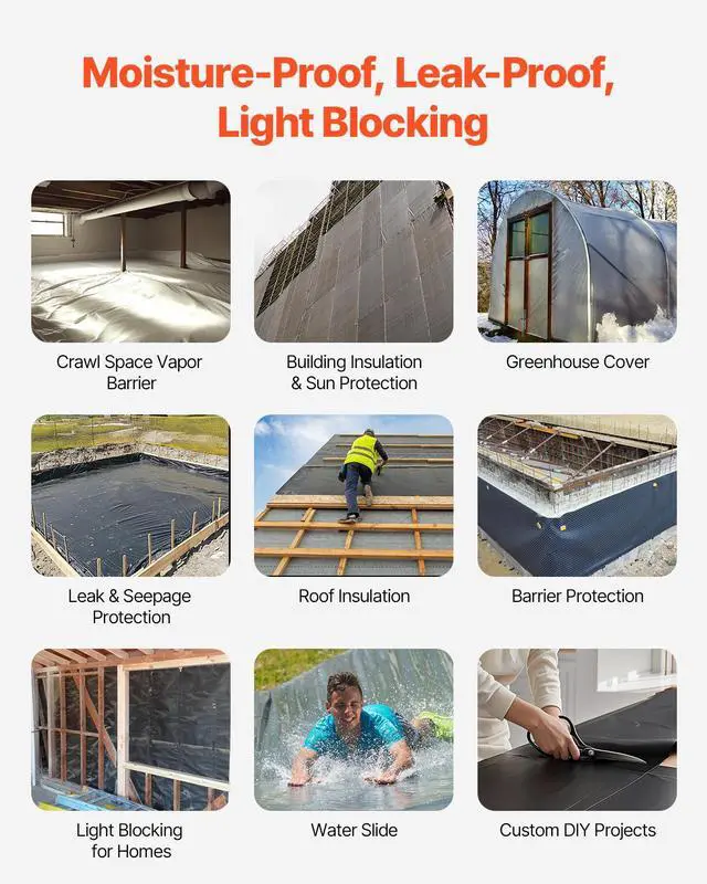 • VEVOR 5 x 100 FT Plastic Sheeting Heavy Duty, 10Mil Thick Plastic Sheeting Roll, Plastic Drop Cloth Painters Tarp, Polyethylene Covering for Crawl Space Vapor Barrier, Multi-Purpose, Black
