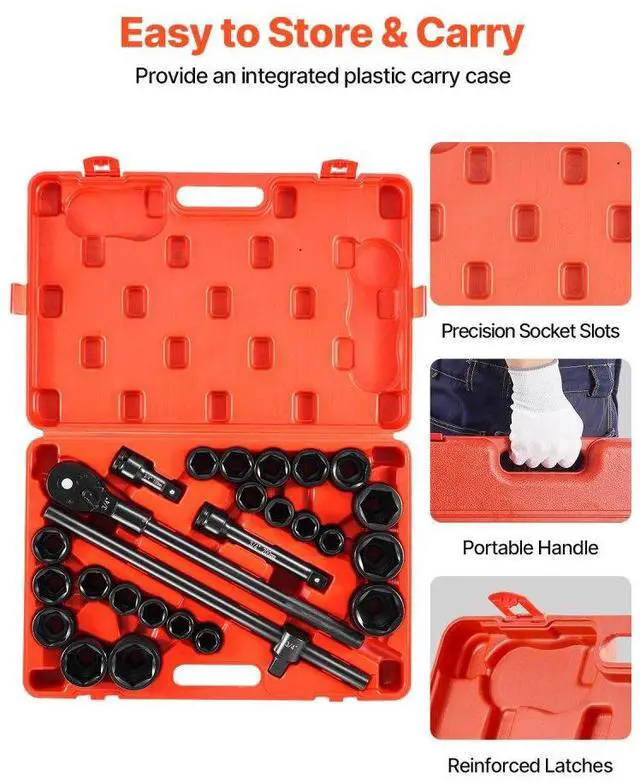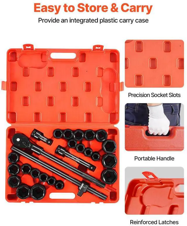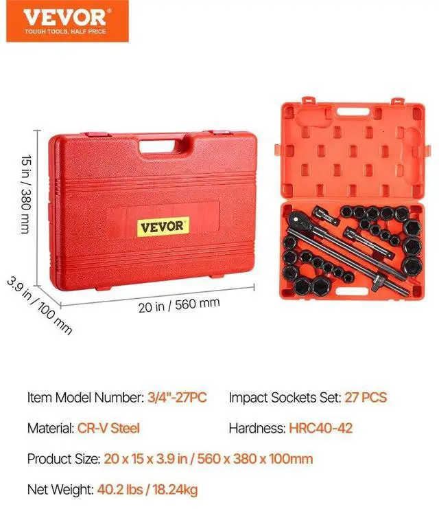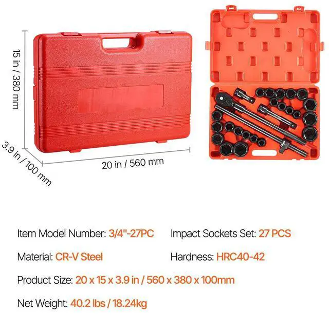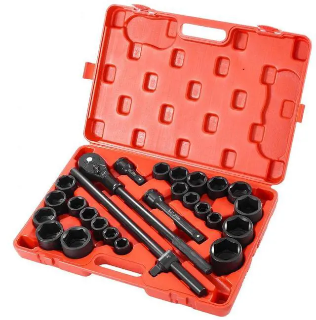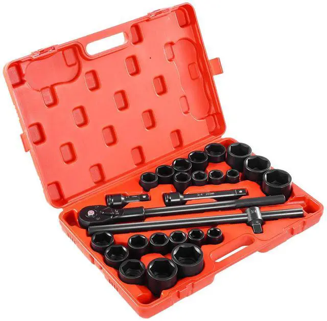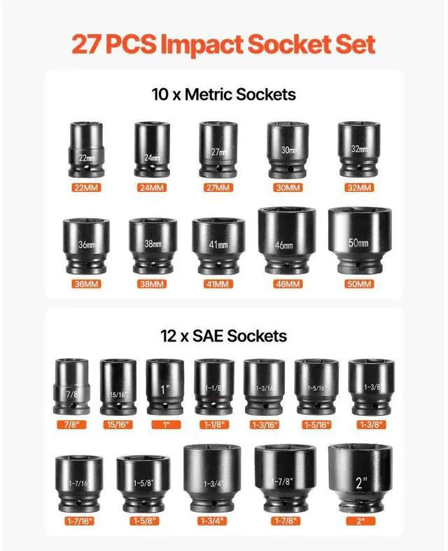 Impact Socket Set 3/4 Inches 27 Piece SAE 7/8 to 2 Inches and Metric 22 to 50 mm, Rugged Construction, 6-Point Hex Socket Design, Easy-to-Read Size Markings, 22 Sockets Included, Sturdy Storage Case, Wide Application, Impact