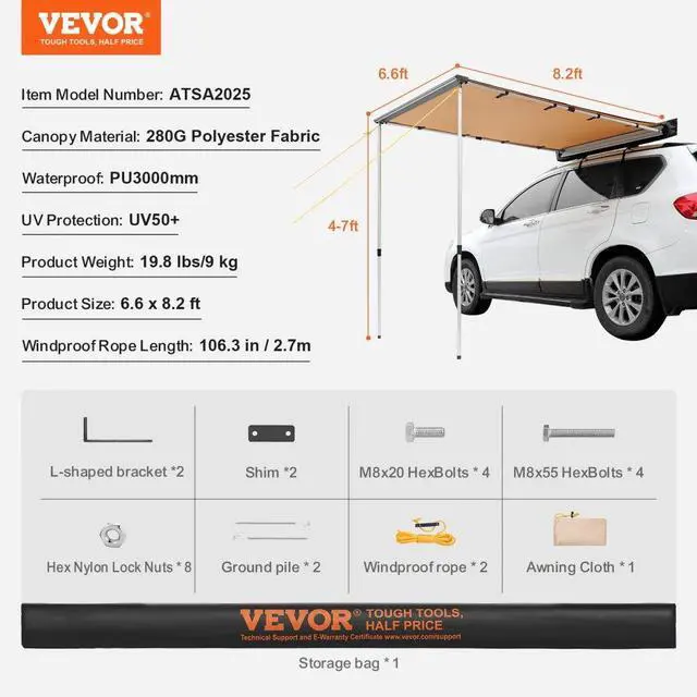 VEVOR Car Side Awning, Large 6.6' x 8.2' Shade Coverage Vehicle Awning, PU3000mm UV50+ Retractable Car Awning with Waterproof Storage Bag, Height Adjustable, Suitable for Truck, SUV, Van, Campers