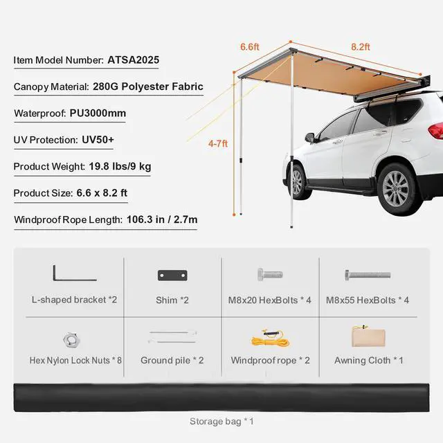 UV Protection: UV50+,Waterproof: PU3000mm,Canopy Material: 280G Polyester Fabric,Windproof Rope Length: 106.3 in / 2.7m,Item Model Number: ATSA2025,Product Weight: 19.8 lbs/9 kg,Product Size: 6.6 x 8.2 ft