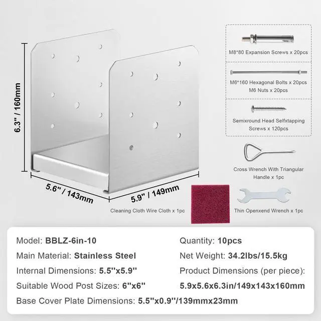 Product Dimensions (per piece): 5.9x5.6x6.3 in/149x143x160 mm,Model: BBLZ-6in-10,Quantity: 10 pcs,Net Weight: 3.5 lbs/1.6 kg,Main Material: Stainless Steel