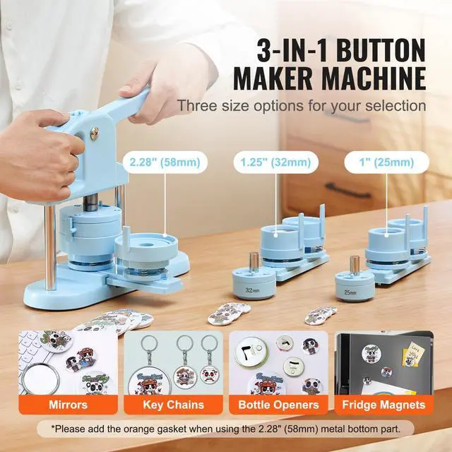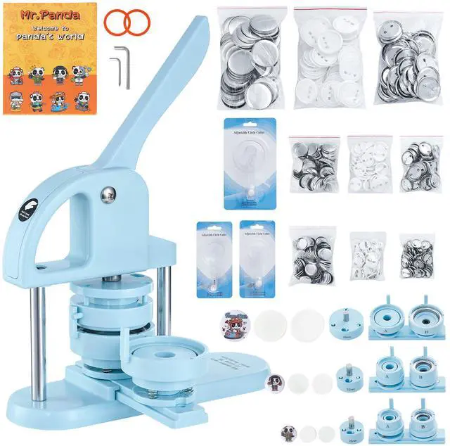 VEVOR 3-IN-1 Button Maker, 1/1.25/2.28 inch(25/32/58mm) Pin Maker, 300pcs Button Parts, Button Maker Machine with Panda Magic Book, Ergonomic Arc Handle Punch Press Kit, For Children DIY Gifts, Blue