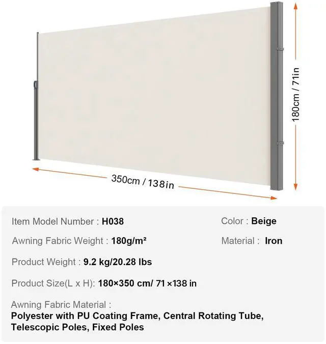 Frame, Central Rotating Tube, Telescopic Poles, Fixed Poles Material: Iron,Product Size(L x H): 180×350 cm/5.91x11.48 FT,Awning Fabric Weight: 180g/m²,Awning Fabric Material: Polyester with PU Coating,Color: Beige,Item Model Number: H038,Product Weight: 9.2 kg/20.28 lbs
