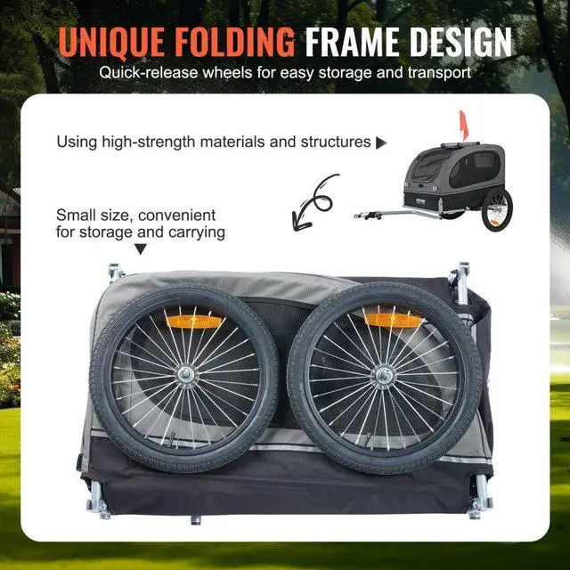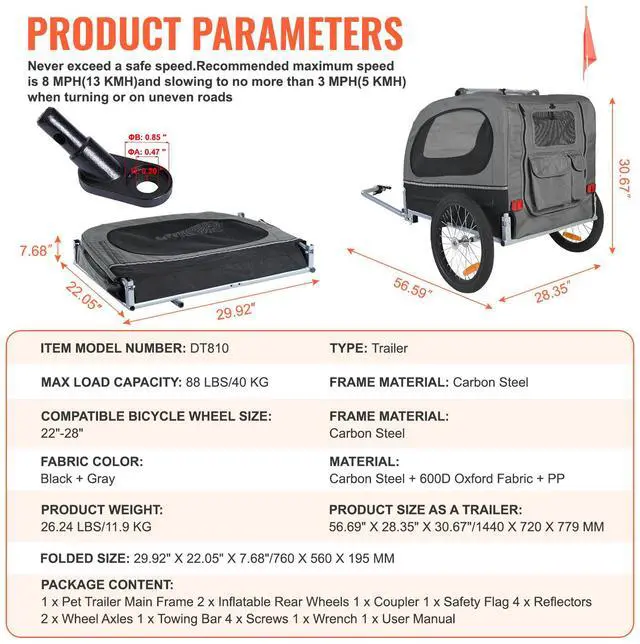 Type: Trailer,Pet Compartment Size: 31.5" x 21" x 20.8"/800 x 535 x 530 mm,Item Model Number: DT810,Product Weight: 26.24 lbs/11.9 kg,Folded Size: 29.92" x 22.05" x 7.68"/760 x 560 x 195 mm,Max Load Capacity: 88 lbs/40 kg,Frame Material: Carbon Steel,Material: Carbon Steel + 600D Oxford Fabric + PP,Compatible Bicycle Wheel Size: 22"-28",Fabric Color: Black + Gray,Product Size as a Trailer: 56.69" x 28.35" x 30.67"/1440 x 720 x 779 mm