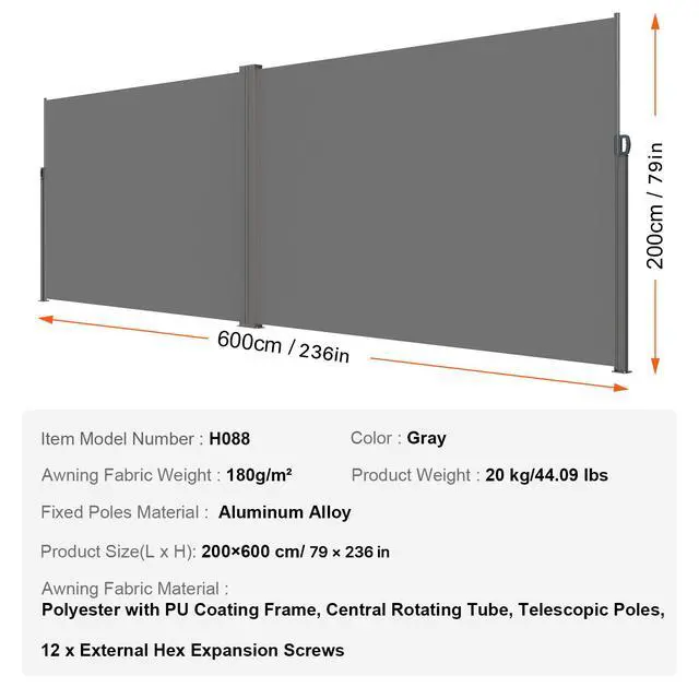 Frame, Central Rotating Tube, Telescopic Poles, Fixed Poles Material: Iron,Product Size(L x H): 200×600 cm/6.56x19.68 FT,Awning Fabric Weight: 180g/m²,Awning Fabric Material: Polyester with PU Coating,Color: Gray,Item Model Number: H038,Product Weight: 20 kg/44.09 lbs