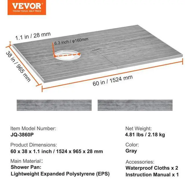 Model: JQ-3860P,Shower Pan Main Material: Lightweight Expanded Polystyrene (EPS),Product Dimensions: 60 x 38 x 1.1 inch / 1524 x 965 x 28 mm,Net Weight: 4.81 lbs / 2.18 kg