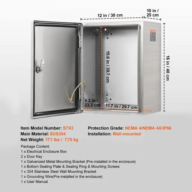 Interior Dimensions: 15.6 x 11.7 x 9.2 in / 39.7 x 29.7 x 23.3 cm,Installation: Wall-mounted,Item Model Number: SP-B3-403025,Bottom Outlet Size: 6.7 x 2 in / 17 x 5 cm,Protection Grade: NEMA 4/NEMA 4X/IP66,Net Weight: 15.2 lbs / 6.9 kg,Main Material: SUS304,Overall Dimensions: 16 x 12 x 10 in / 40 x 30 x 25 cm