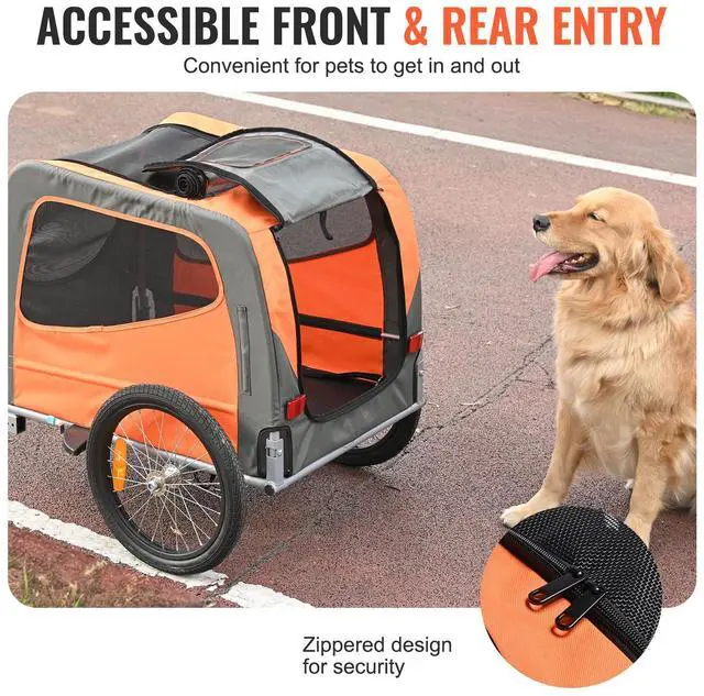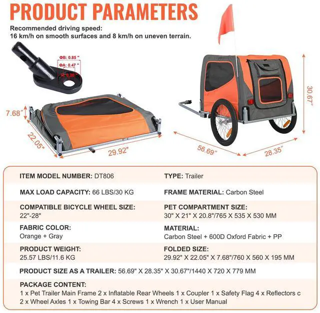 Type: Trailer,Pet Compartment Size: 30" x 21" x 20.8"/765 x 535 x 530 mm,Item Model Number: DT806,Product Weight: 25.57 lbs/11.6 kg,Folded Size: 29.92" x 22.05" x 7.68"/760 x 560 x 195 mm,Max Load Capacity: 66 lbs/30 kg,Frame Material: Carbon Steel,Material: Carbon Steel + 600D Oxford Fabric + PP,Compatible Bicycle Wheel Size: 22"-28",Fabric Color: Orange + Gray,Product Size as a Trailer: 56.69" x 28.35" x 30.67"/1440 x 720 x 779 mm
