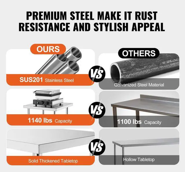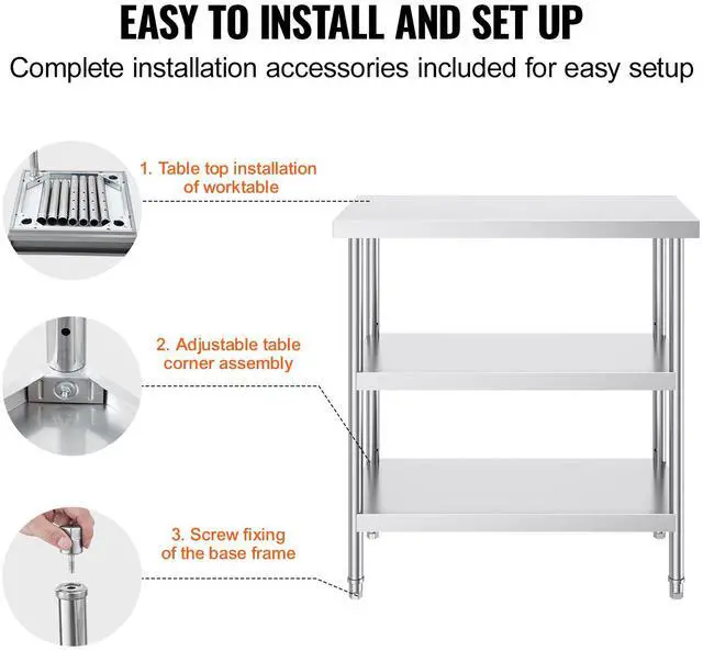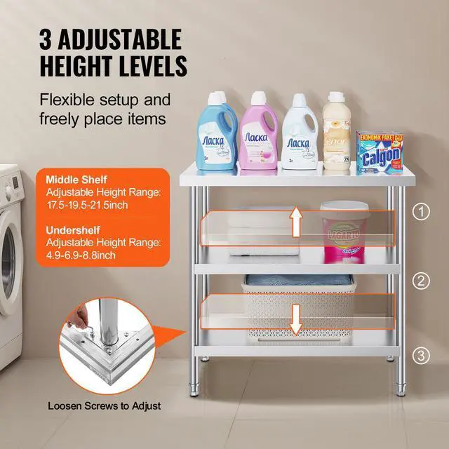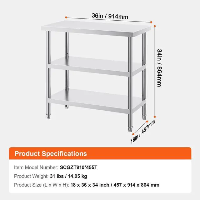 VEVOR Stainless Steel Food Prep Table, 18 x 36 x 34 Inch Commercial Kitchen Worktable, with 2 Adjustable Undershelf, Heavy Duty Prep Table Metal Work Table for BBQ, Kitchen, Home, and Garage