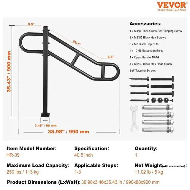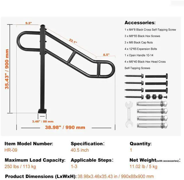 Applicable Steps: 1-3,Model: HR-09,Maximum Load Capacity: 250 lbs / 113 kg,Product Domensions (LxWxH): 38.98x3.46x35.43 in / 990x88x900 mm,Quantity: 1 PCS,Specification: 40.5 inch / 1029 mm,Main Material: Q235A Carbon Steel,Net Weight(with accessories): 11.02 lb / 5 kg