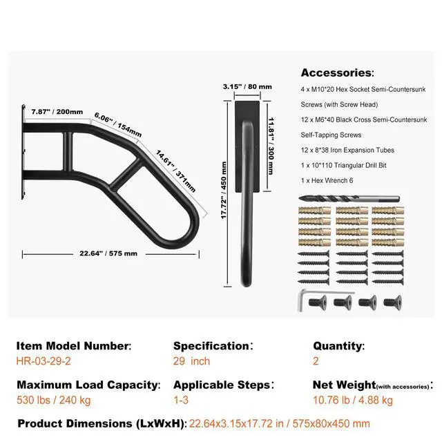 Applicable Steps: 1-3,Model: HR-03-29-2,Maximum Load Capacity: 530 lbs / 240 kg,Product Domensions (LxWxH): 22.64x3.15x17.72 in / 575x80x450 mm,Quantity: 2 PCS,Specification: 29 inch / 737 mm,Main Material: Q235A Carbon Steel,Net Weight(with accessories): 10.76 lb / 4.88 kg