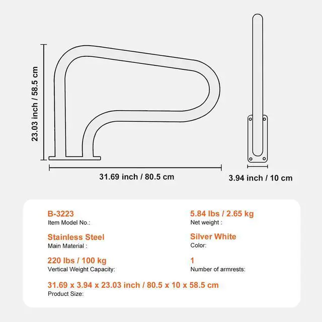 Color: Silver White,Product Net Weight: 5.84 lbs / 2.65 kg,Vertical Load Capacity: 220 lbs / 100 kg,Item Model No.: B-3223,Main Material: Stainless Steel,Product Size: 31.69 x 3.94 x 23.03 inch / 805 x 100 x 585 mm