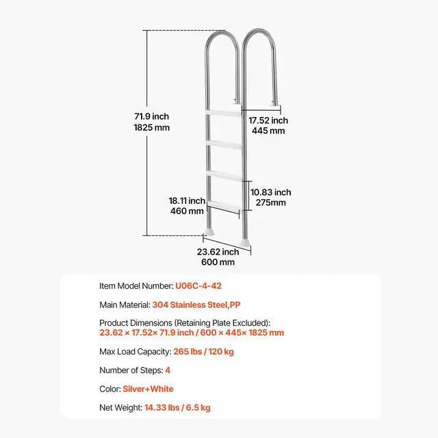 Number of Steps: 4,Color: Silver + White,Item Model Number: U06C-4-42,Max Load Capacity: 265 lbs / 120 kg,Product Dimensions: 23.62 x 17.52 x 71.9 inch / 600 x 445 x 1825 mm,Net Weight: 14.33 lbs / 6.5 kg,Main Material: 304 Stainless Steel, PP