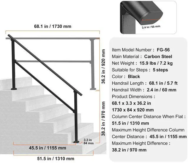 Maximum Height Difference Column Center Distance: 45.5 in / 1155 mm,Handrail Width: 2.4 in / 60 mm,Handrail Length: 68.1 in / 5.7 ft,Column Center Distance When Flat: 58.3 in / 1480 mm,Color: Black,Item Model Number: FG-56,Product Dimensions: 68.1 x 3.3 x 36.2 in / 1730 x 84 x 920 mm,Suitable for Steps: 5-6 steps,Net Weight: 15.9 lbs / 7.2 kg,Maximum Height Difference: 38.2 in / 970 mm,Adjustable Angle: 30° - 40°,Main Material: Carbon Steel