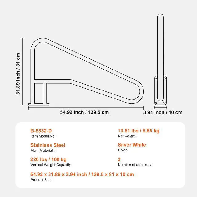 Vertical Weight Capacity: 220 lbs / 100 kg,Color: Silver White,Item Model No.: B-5532-D,Net Weight: 19.51 lbs / 8.85 kg,Main Material: Stainless Steel,Product Size: 54.92 x 31.89 x 3.94 inch / 1395 x 810 x 100 mm,Number of handrails: 2 pieces