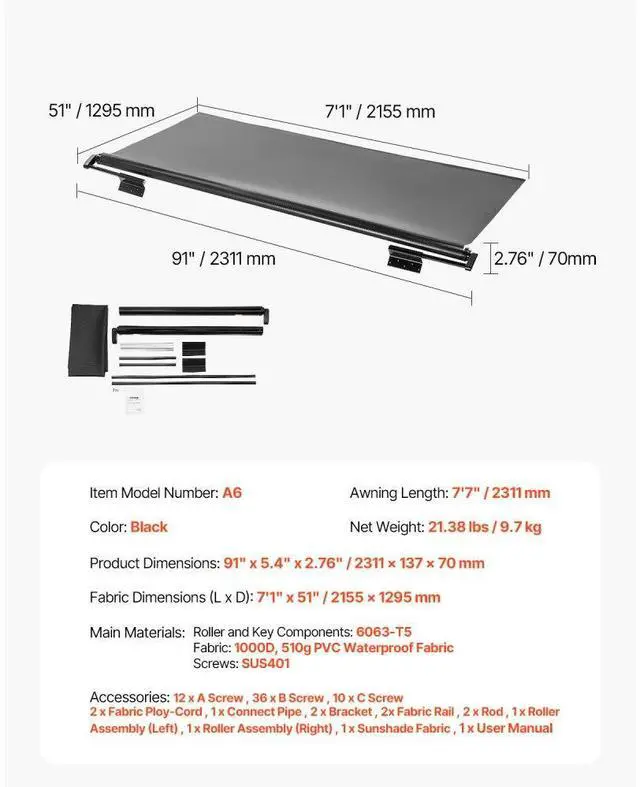 Fabric Dimensions (L x D): 7'1" x 51" / 2155 x 1295 mm,Main Materials:,Awning Length: 7'7" / 2311 mm,Screws: SUS401,Color: Black,Item Model Number: A6,Roller and Key Components: 6063-T5,Product Dimensions: 91" x 5.4" x 2.76" / 2311 x 137 x 70 mm,Fabric: 1000D, 510g PVC Waterproof Fabric,Net Weight: 21.38 lbs / 9.7 kg