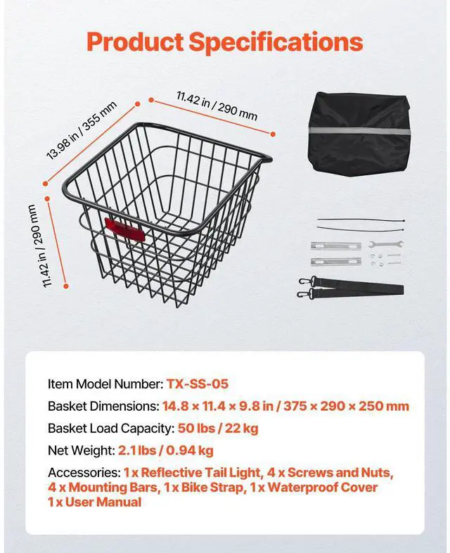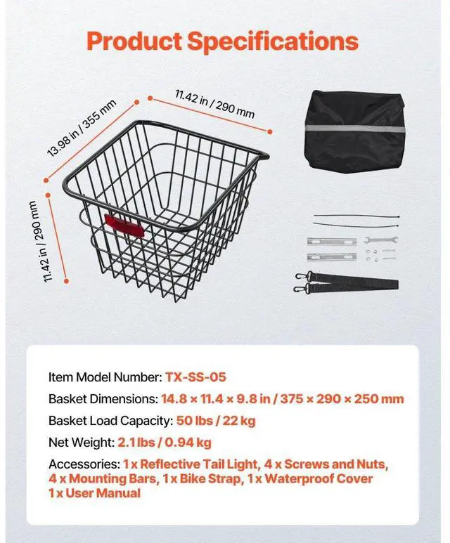Item Model Number: TX-SS-05,Basket Dimensions: 14.8 x 11.4 x 9.8 in / 375 x 290 x 250 mm,Net Weight: 2.1 lbs / 0.94 kg,Basket Load Capacity: 50 lbs / 22 kg