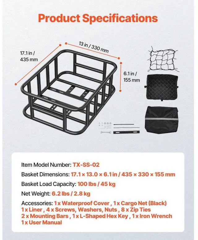 Item Model Number: TX-SS-02,Basket Dimensions: 17.1 x 13.0 x 6.1 in / 435 x 330 x 155 mm,Net Weight: 6.2 lbs / 2.8 kg,Basket Load Capacity: 100 lbs / 45 kg
