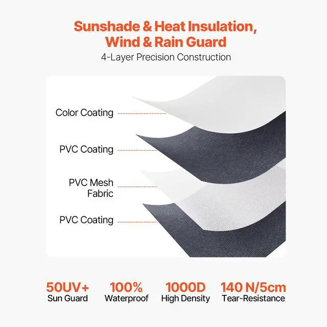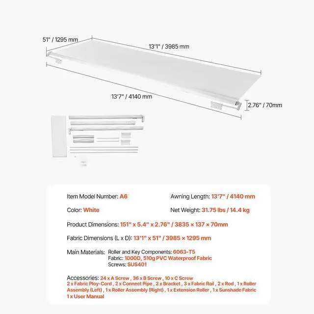Fabric Dimensions (L x D): 13'1" x 51" / 3985 x 1295 mm,Main Materials:,Awning Length: 13'7" / 4140 mm,Screws: SUS401,Color: White,Item Model Number: A6,Roller and Key Components: 6063-T5,Product Dimensions: 151" x 5.4" x 2.76" / 3835 x 137 x 70 mm,Fabric: 1000D, 510g PVC Waterproof Fabric,Net Weight: 31.75 lbs / 14.4 kg