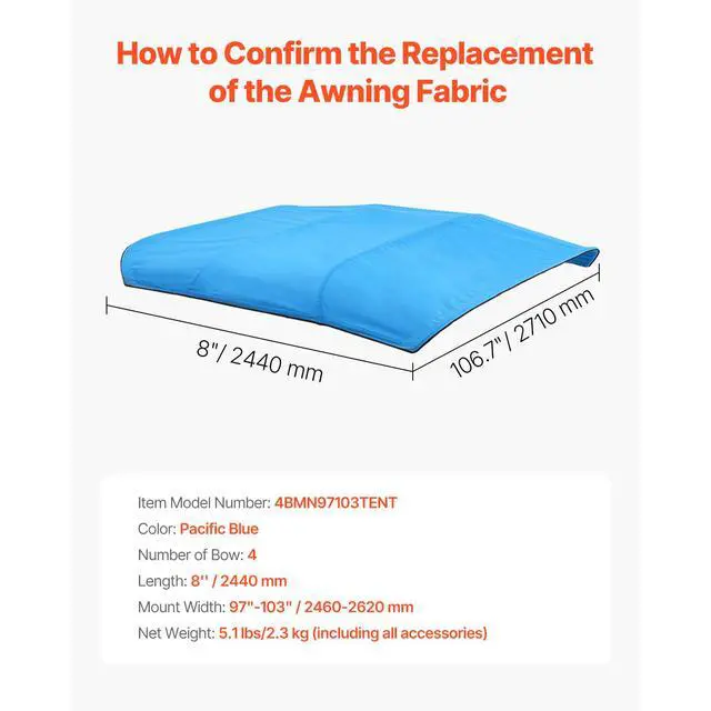 4 Bow Boat Bimini Tops 96"Lx(97"-103")W Awning Top Replacement Pacific Blue