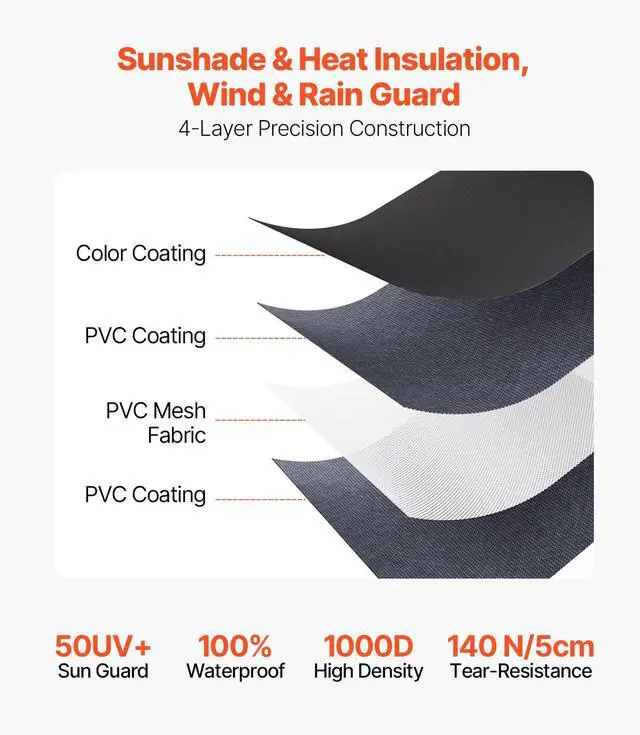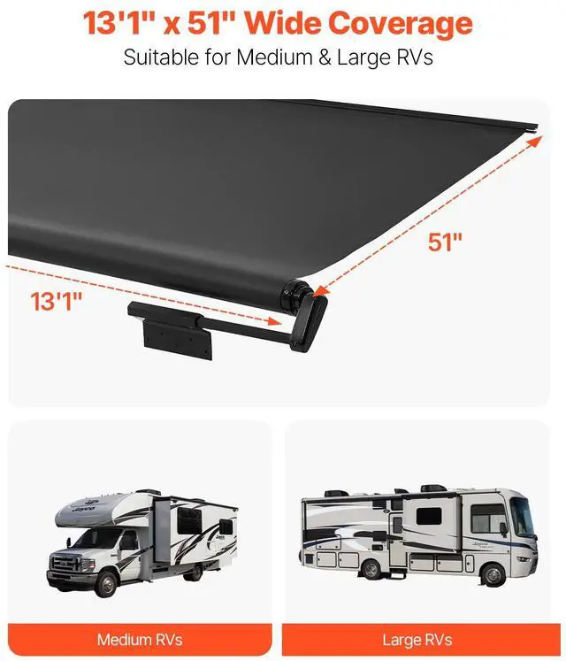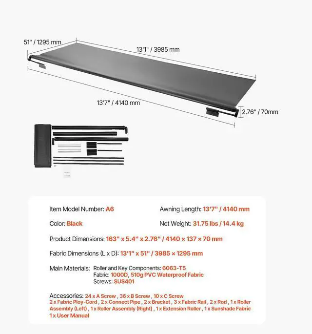 Fabric Dimensions (L x D): 13'1" x 51" / 3985 x 1295 mm,Main Materials:,Awning Length: 13'7" / 4140 mm,Screws: SUS401,Color: Black,Item Model Number: A6,Roller and Key Components: 6063-T5,Product Dimensions: 163" x 5.4" x 2.76" / 4140 x 137 x 70 mm,Fabric: 1000D, 510g PVC Waterproof Fabric,Net Weight: 31.75 lbs / 14.4 kg