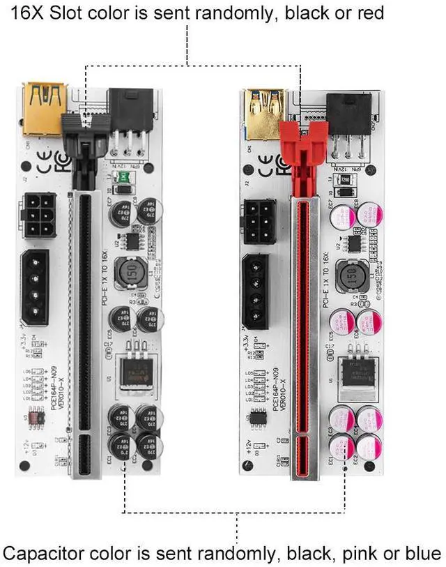 Due to the shortage of raw materials, we have purchased the 2 color card slots and Capacitors for production, randomly send, it does not affect the riser's function.
