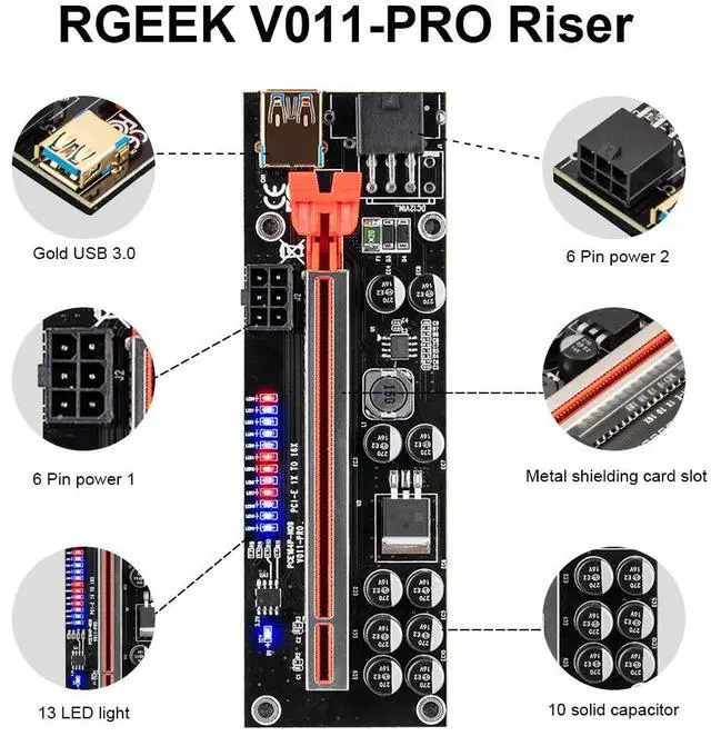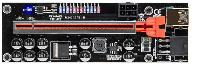 Version 011 Pro riser kits are the est and top of the line solution for setting up GPU mining rigs. Two Graphic card 6PIN interface are optional to power, which provides Graphic card independent power and reduces motherboard burden when using more Graphic cards. LED Display board, 10 Solid Capacitors, 60cm USB 3.0 cable, Suitable for all Window systems, LINUX and MAC.