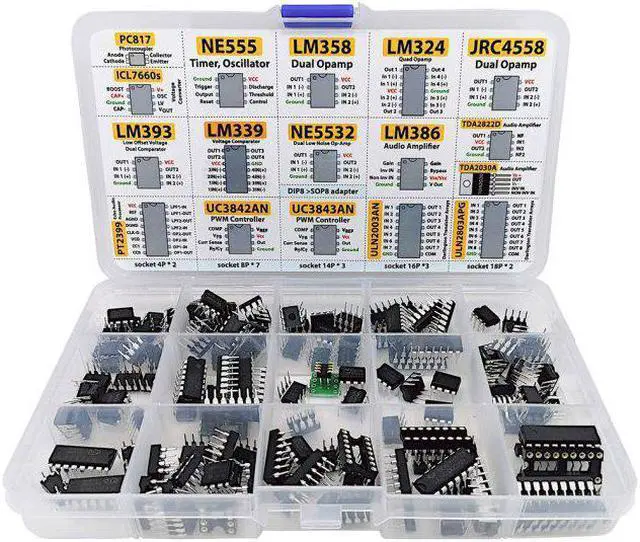 1. Huge IC assortment contains: PC817, NE555, LM358, LM324, JRC4558, LM393, LM339, NE5532, LM386, TDA2030, TDA2822, PT2399, UC3842AN, UC3843AN, ULN2003AN, ULN2803APG, ICL7660S.