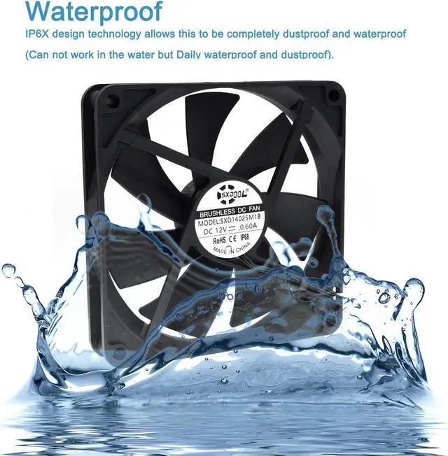 This is the waterproof fan. However, when the fan is powered up in water, the fan cannot run, because the water resistance is more stronger than the power of the fan, but the fan is still good and will not be damaged. When the height of water is 50-70% of the fan, the fan can run.Please watch the video.