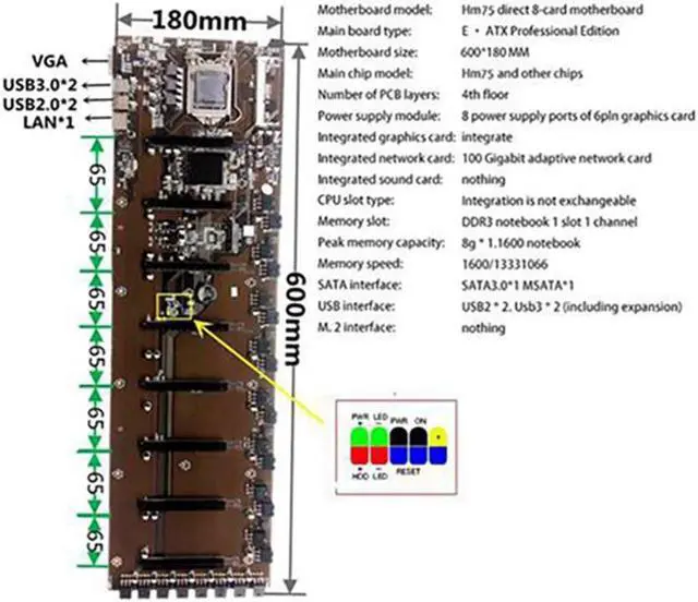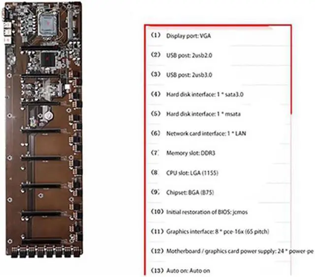 B75 BTC Mining Motherboard 8 PCI-E Graphics Card Slot 65mm LGA 1155 DDR3 RAM SATA3.0 USB3.0 Motherboard with I3 2100 CPU