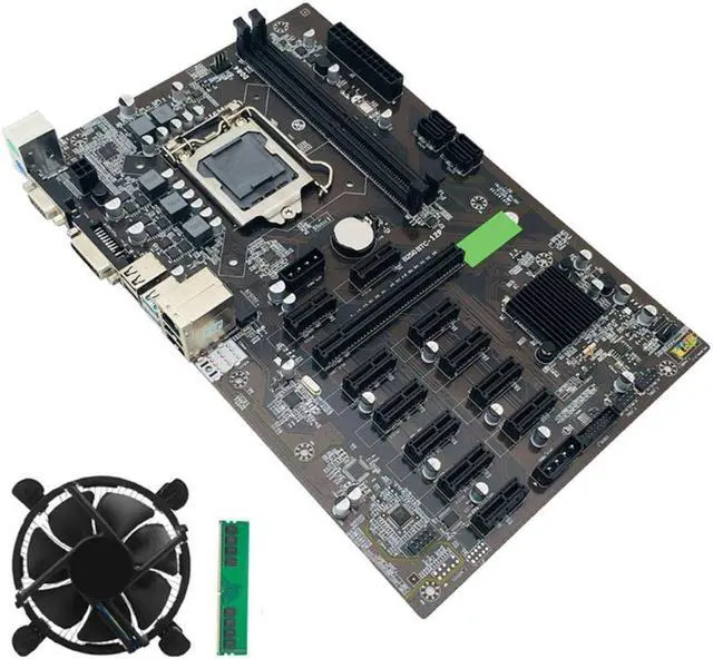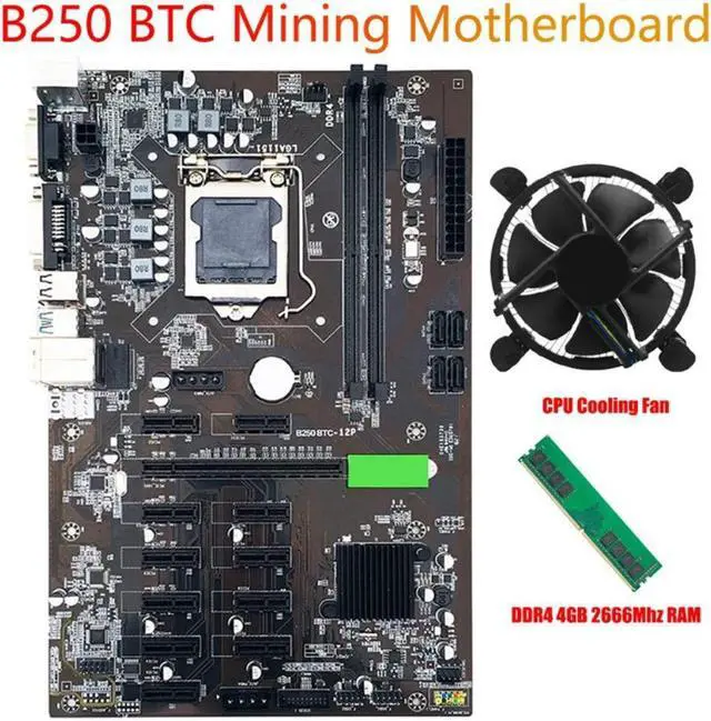 B250 BTC Mining Motherboard LGA 1151 with DDR4 4GB 2666MHZ RAM +Cooling Fan 12 GPU Bitcoin Etherum Mining Motherboard