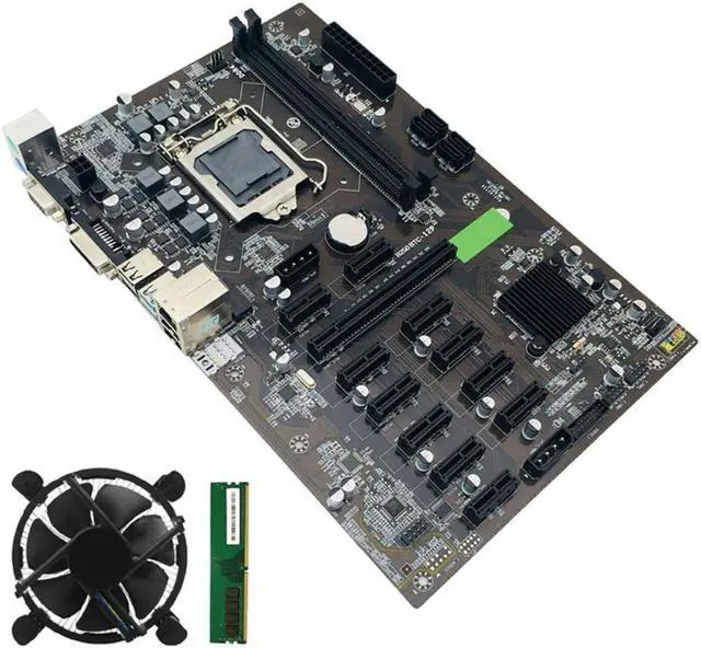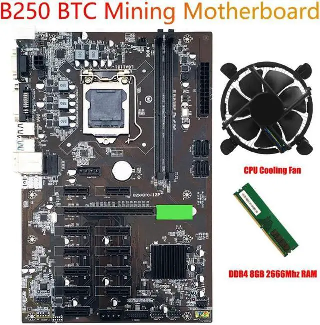 B250 BTC Mining Motherboard PCIe X1 PCI-E X16 LGA 1151 with DDR4 8GB 2666MHZ RAM +Cooling Fan for Graphics Card Miner