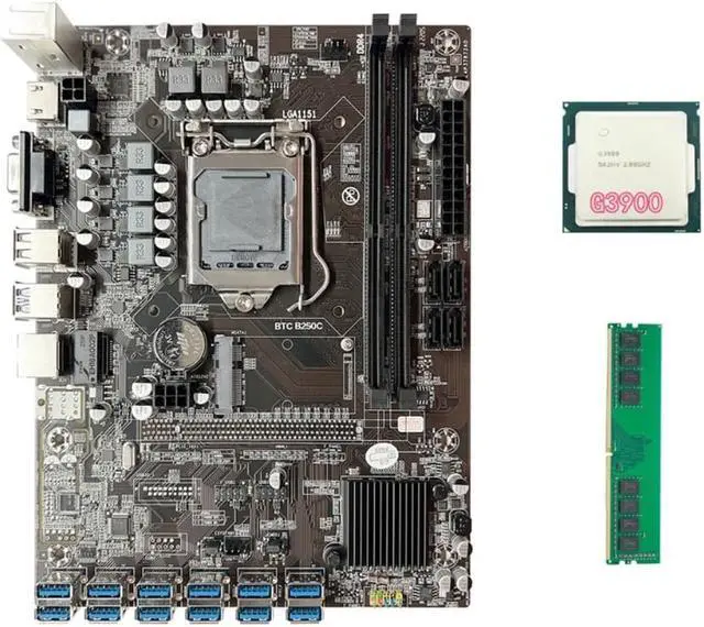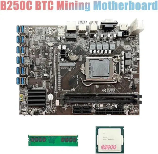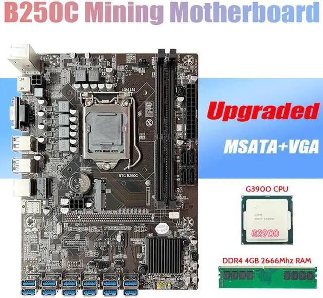 BTC B250C BTC Miner Motherboard with G3900 CPU+DDR4 4GB 2666MHZ RAM 12XPCIE to USB3.0 Card Slot MSATA for ETH Mining