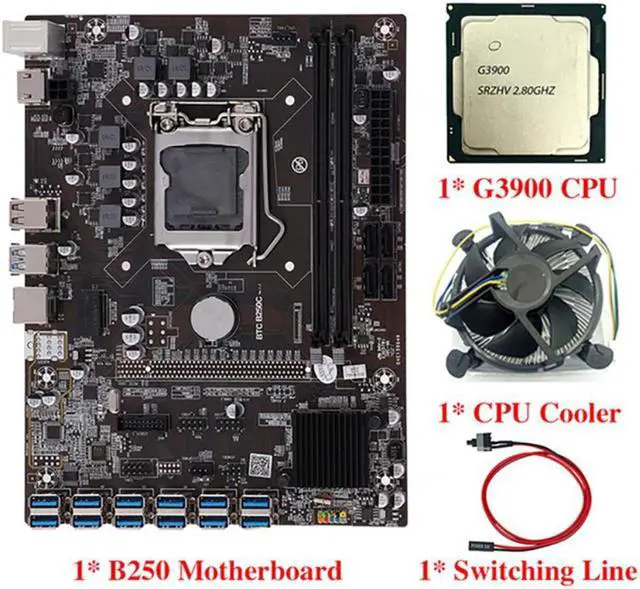B250C BTC Mining Motherboard with G3900 CPU+Cooling Fan+Switch Cable+SATA Cable 12 USB3.0 Slot LGA1151 DDR4 RAM SATA3.0